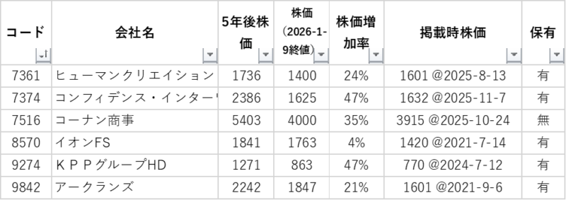 5年後株価達成リストに移行した銘柄は27銘柄で、予測リストに残された銘柄は6銘柄となった。