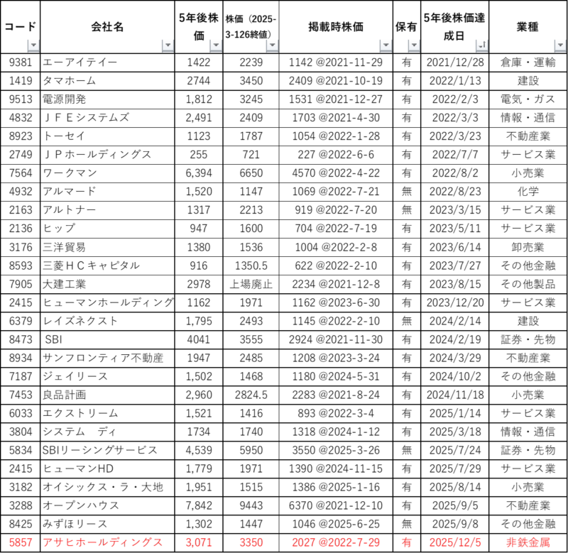 5年後株価予測リストのうち、半分近くの銘柄が2年以内に予測株価になってしまった。予測が正確だったのかどうかの議論は別として、事実は事実として記録しておきたい。